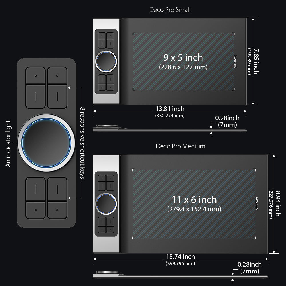 The XPPen Deco Pro Series Drawing Tablet comes in two sizes for your option. The Deco Pro Small features a 9x5 inch working area, offering a compact and portable option while the Deco Pro Medium features an 11 x 6 inch working area, giving you a bigger canvas for your creations.