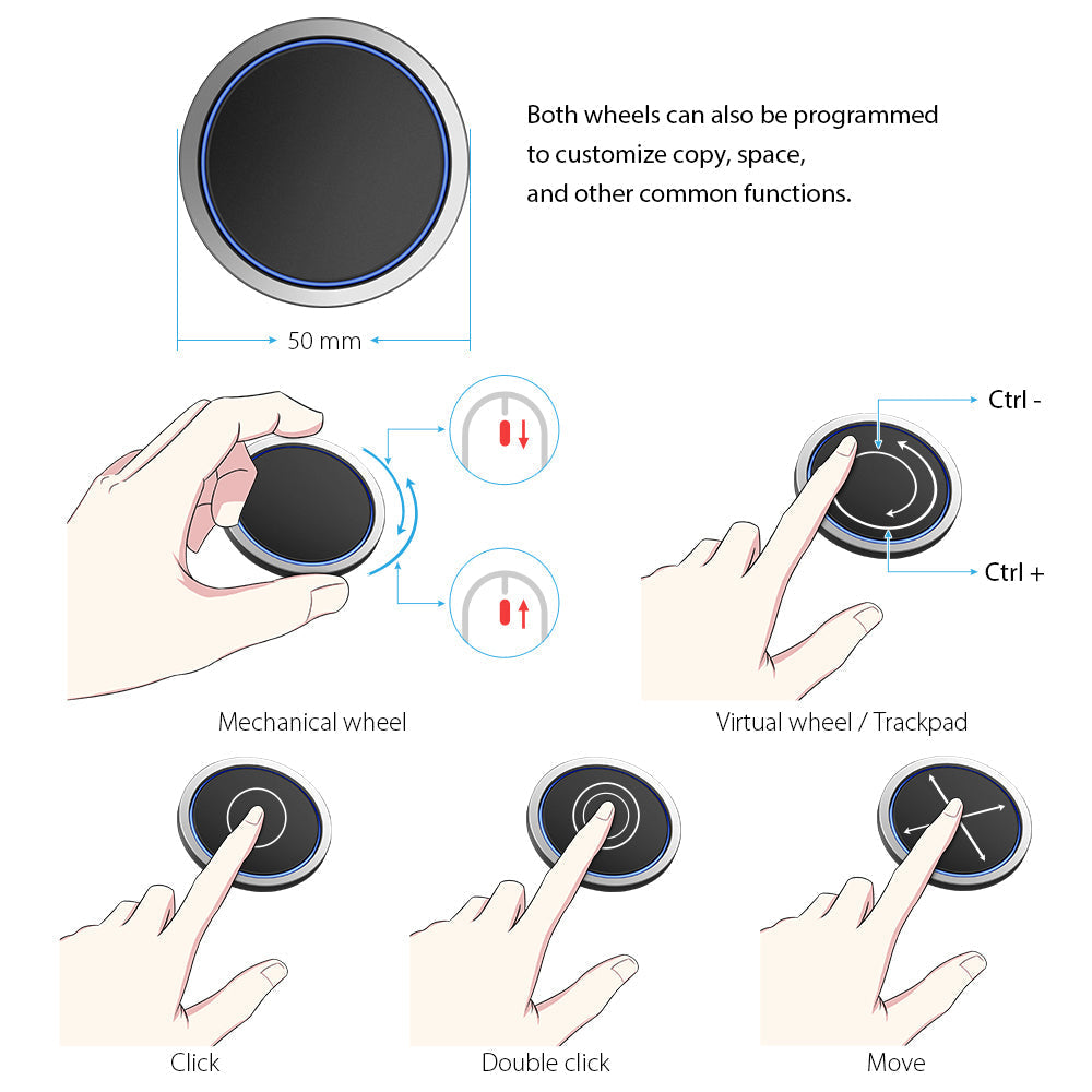Meet the groundbreaking double wheel design paired with trackpad functionality! With a bigger wheel, it is easier to control and operate more accurately. Use the outer mechanic wheel to zoom in /out of your canvas, adjust brush size, etc, while the inner virtual wheel can be used as a trackpad/mouse mode, scroll up and down, and more. Both wheels can also be programmed to customize copy, space, and other common functions. Fully utilize the two wheel together and use 4 shortcuts at the same time without switching back and forth to guarantee a complete focus on your creation and unparalleled efficiency.