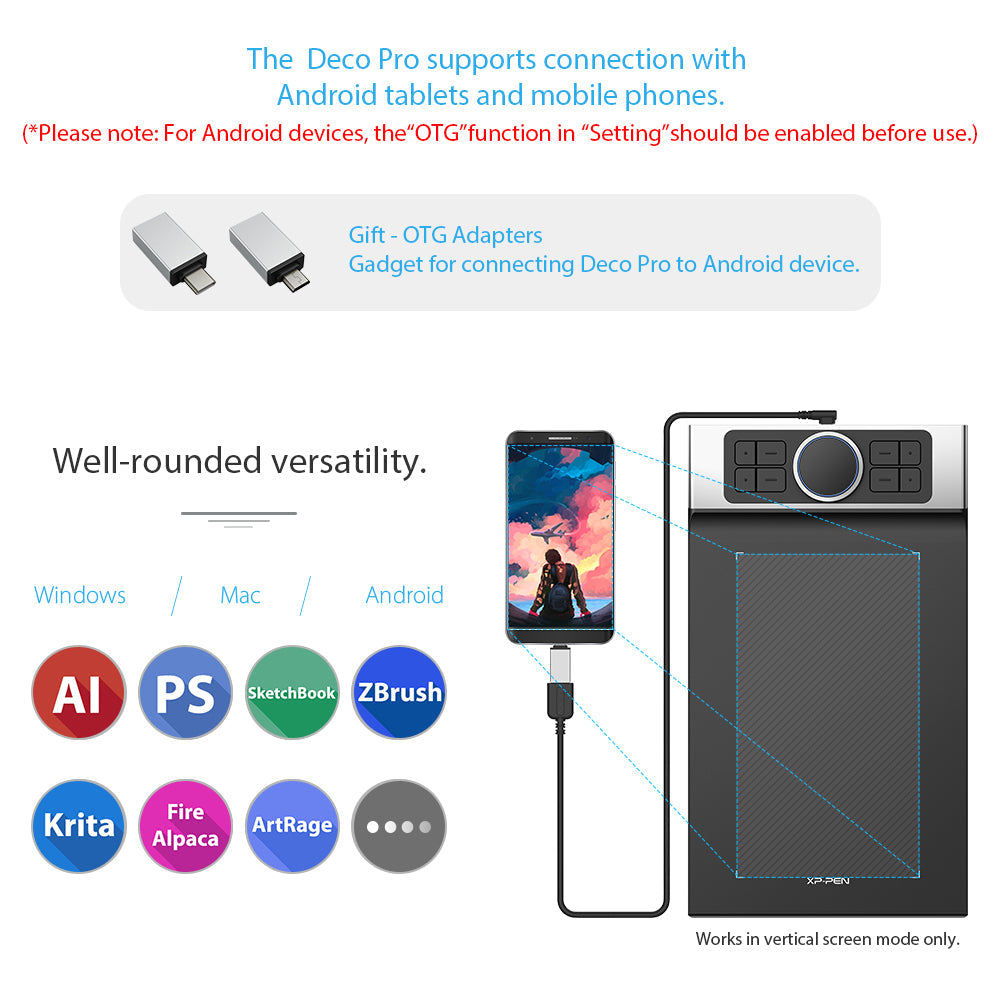 The XP-Pen Deco Pro Series is compatible with Windows 7/8/10, Mac OS X 10.10 and above, Android 6.0 and above. Works with most major creative software including Photoshop, SAI, Painter, Illustrator, Clip Studio, GIMP, Medibang, Krita, Fire Alpaca, Blender? 3D and more.