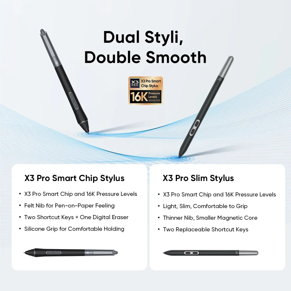 Powered by X3 Pro smart chip, the 16K pressure levels sensitivity provides a lifelike drawing experience. The felt nibs mimic a pen-on-paper feeling. Moreover, the stylus features two shortcut keys and a digital eraser, enhancing its effectiveness for drawing while ensuring comfort with its silicone grip.